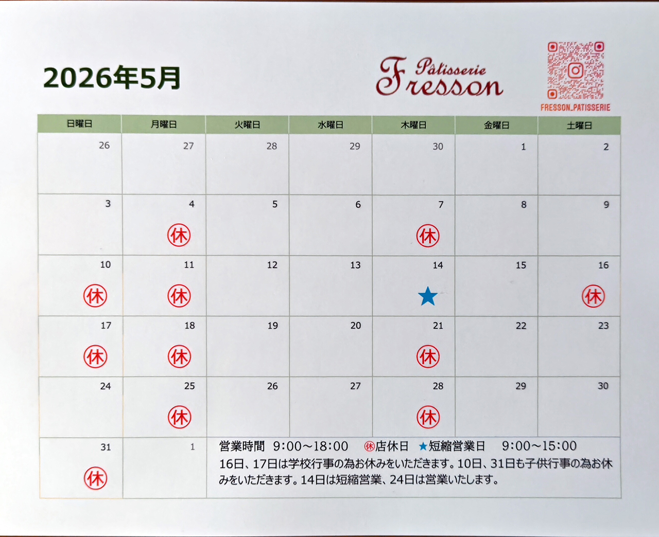 5月の休業日は以下の通りです。